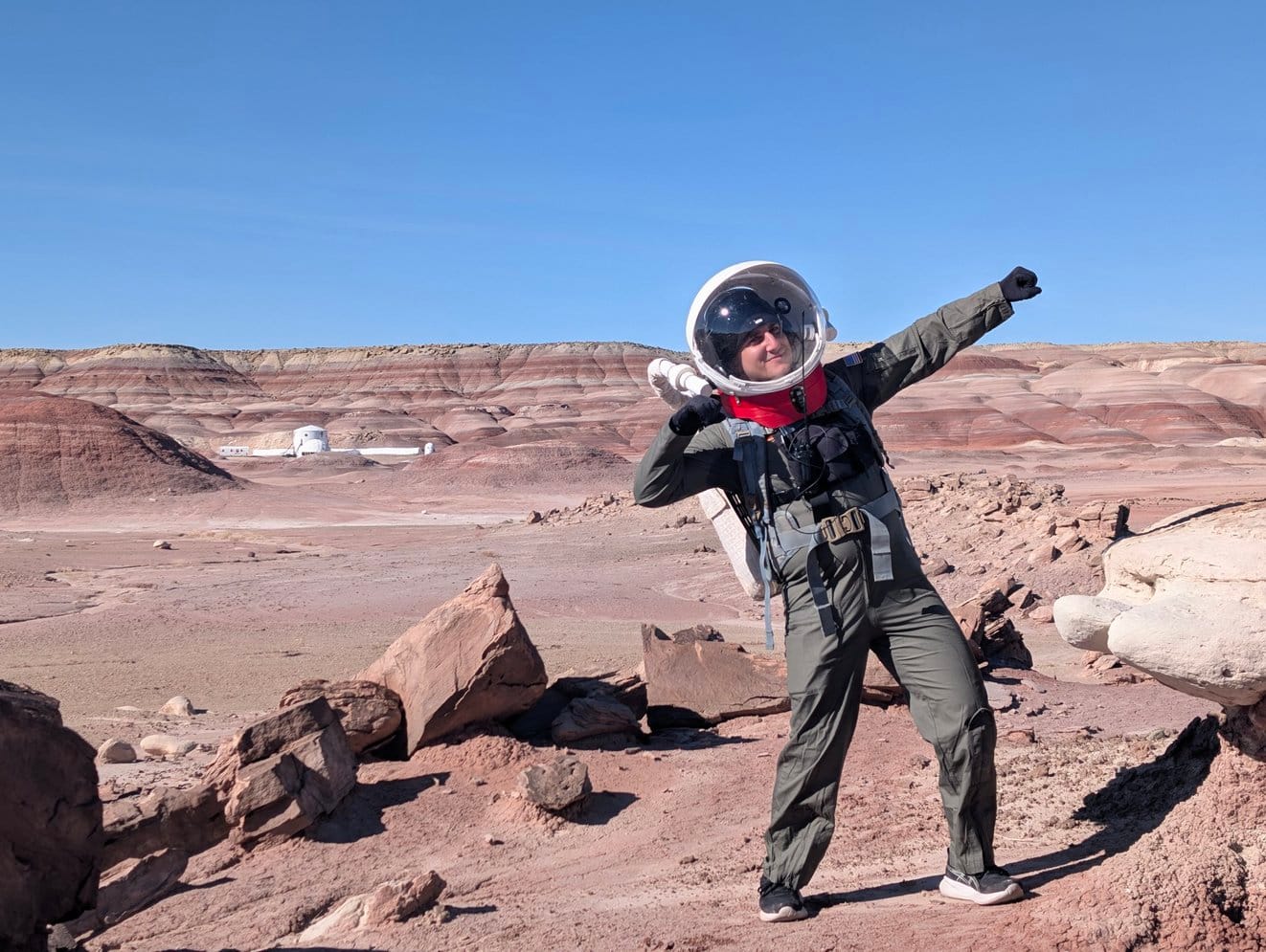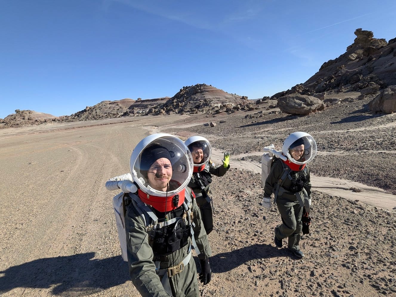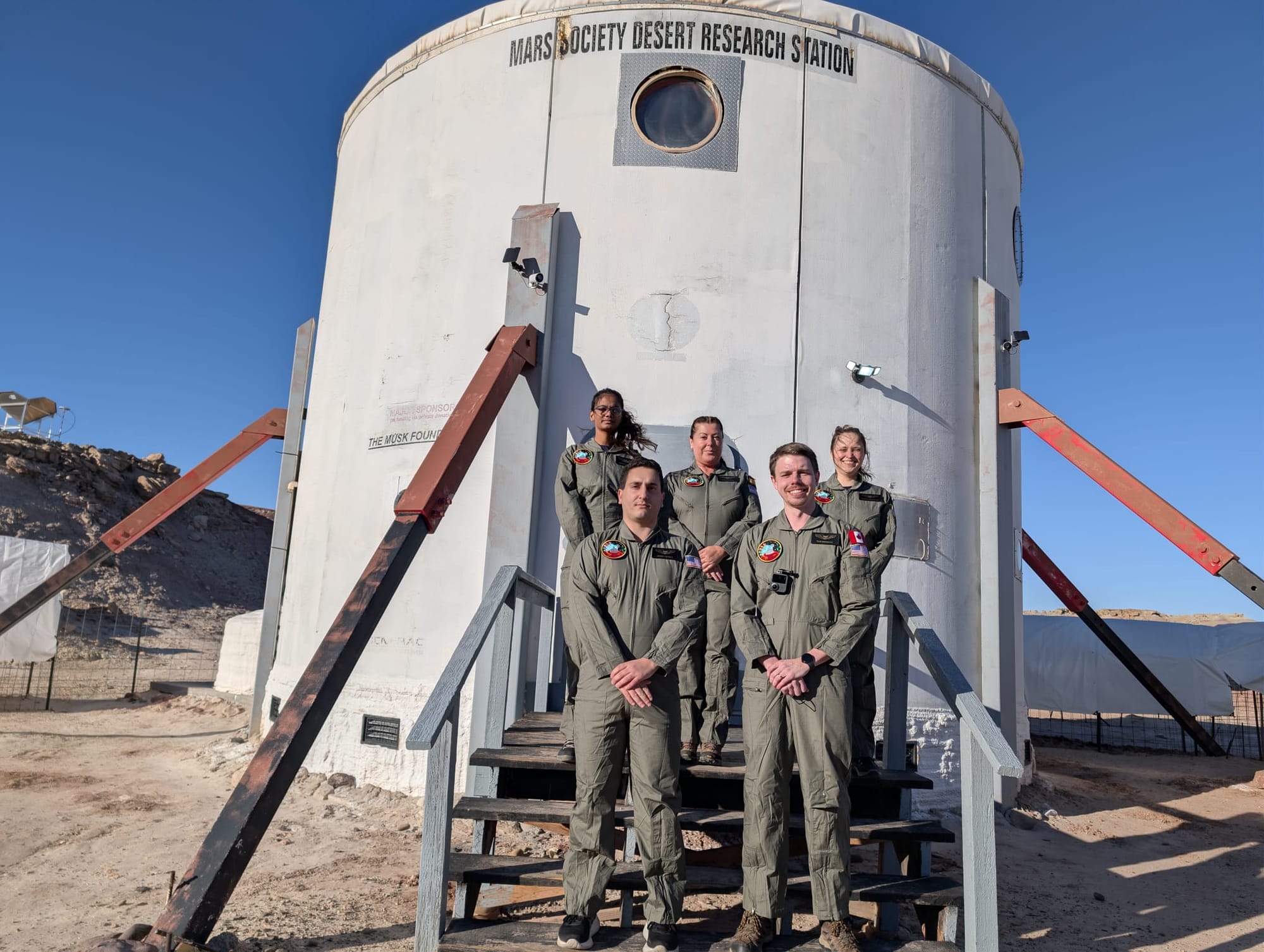 | 0 | Jan 25 | Crew arrives at MDRS. Shuttle dodges 2-meter tumbleweed ("rogue asteroid"). Health checks, orientation, first photo in flight suits. |